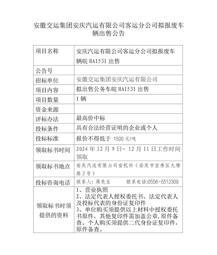 安慶汽運(yùn)有限公司客運(yùn)分公司擬報廢車輛出售公告